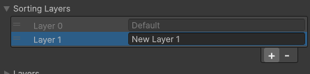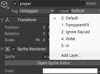 - Sprite Renderer에서 Sorting Layer -> Add Sorting Layer 선택.